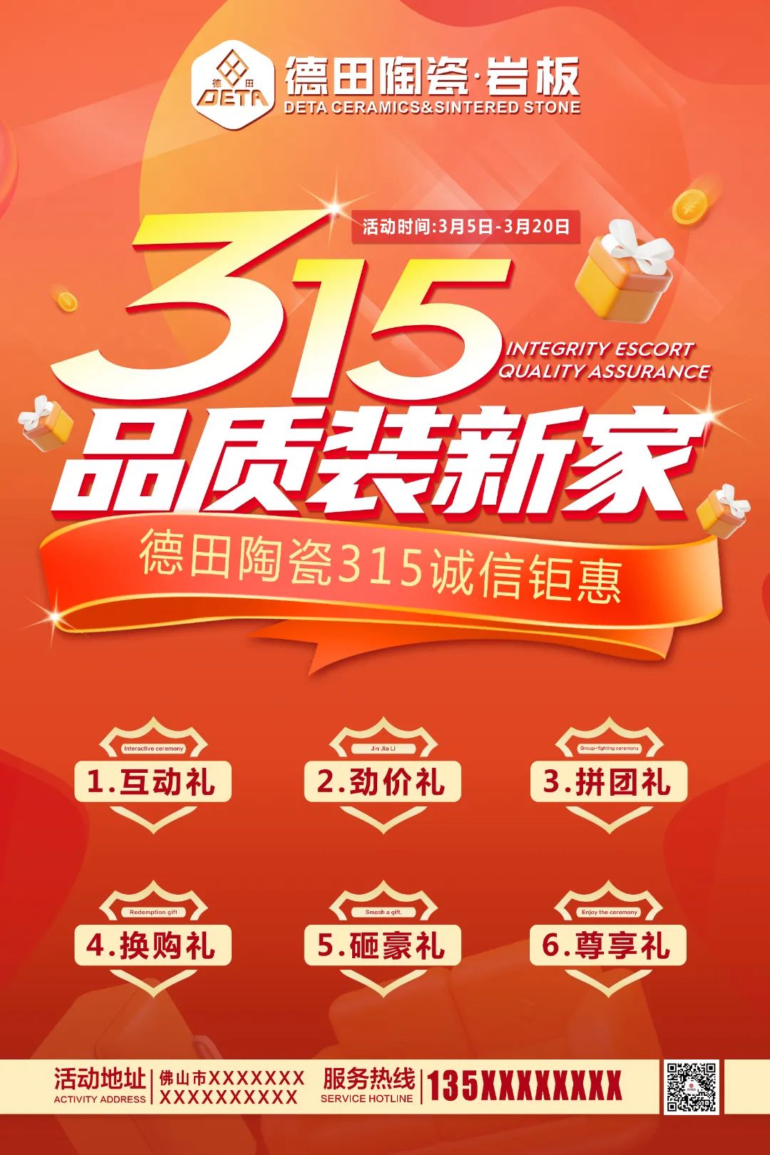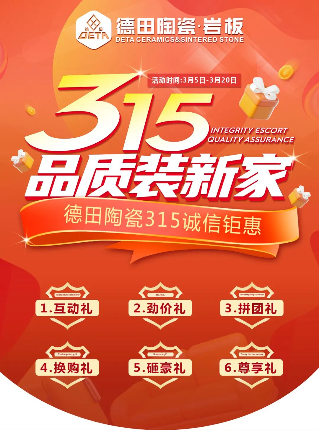 為了更好地配合各地經(jīng)銷商開展3·15促銷活動(dòng),助力終端店面營(yíng)造濃郁的活動(dòng)促銷氛圍、抓住開春時(shí)機(jī),搶占市場(chǎng),贏得門店銷售開門紅,德田陶瓷推出系列促銷方案及設(shè)計(jì)了3·15氛圍相關(guān)物料(含拱門、單張、展架、貼紙等整套源文件)供各位經(jīng)銷商朋友使用。請(qǐng)各經(jīng)銷商家人們咨詢所屬區(qū)域經(jīng)理領(lǐng)取,并在當(dāng)?shù)剡M(jìn)行制作。(方案內(nèi)容僅供參考,經(jīng)銷商可根據(jù)自身實(shí)際需要作出調(diào)整)